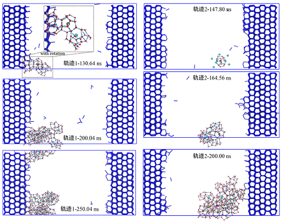 中科院800彩票地球与行星物理院重点实验室的张正财博士后与郭光军研究员使用高精度恒能量分子动力学模拟,在冰-溶液-气体三相体系中进行了微秒级的甲烷水合物成核模拟,并考虑了甲烷水合物相对于冰的成核位置、冰-水合物界面的水分子环以及冰的不同晶面等因素对甲烷水合物成核的影响。