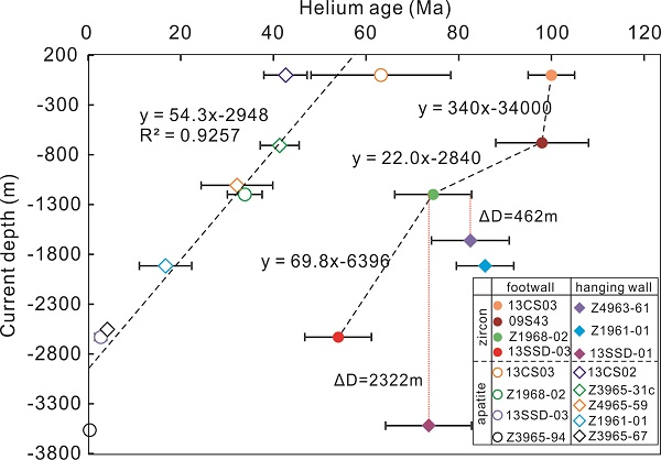 分析发现,矿物中的包裹体可能是导致了单样内年龄分散的主要原因。排除掉受影响的年龄后,通过定性分析发现,锆石(U-Th)/He年龄(能够记录130-210℃温度区间的年龄信息)随深度变大而变年轻(100-55百万年),记录了早白垩世晚期和75-55百万年前两期快速冷却和之间的一期慢速冷却过程;磷灰石(U-Th)/He年龄(能够记录40-80℃温度区间的年龄信息)也随深度增大变年轻(60-0百万年),并且呈良好的线性关系,指示矿床经历了漫长的匀速冷却过程。他们通过计算得到,两次快速冷却及一次匀速冷却过程先后使矿床抬升了0.7km、1.3km和3.0km,确定矿床至今已被剥露了5km。对比锆石年龄发现,同一深度控矿断层上盘年龄大于下盘,指示断层经历了正断活动(与野外构造测量结果一致),通过计算得到,断层断距约为0.5-2.3km。从金矿成矿深度推测,三山岛深部仍有巨大的成矿潜力;从剥蚀程度来看,胶东不适合勘探浅成低温和斑岩型等成矿深度较浅的矿床。