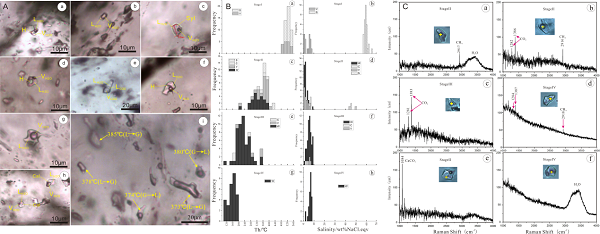 图1 苏云河斑岩型钼矿床流体包裹体类型(A),显微测温(B),以及单个包裹体拉曼结果(C)