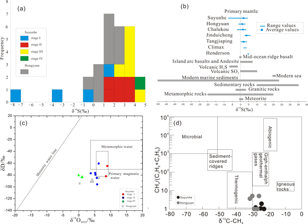 2. δ18O‰值表明前两个阶段成矿流体主要来源于岩浆水,后两个阶段以大气水为主(图2c)。阶段1与阶段2较大的硫化物δ34S‰值差异显示阶段I与阶段II发生了硫同位素分馏作用(图2a),指示成矿流体氧逸度降低的趋势,这与该阶段还原性气体含量升高是一致的。