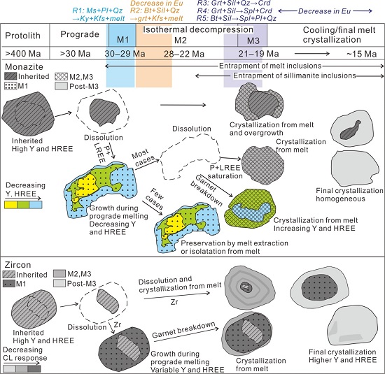 图2定结地区喜马拉雅泥质岩麻粒岩中的独居石和锆石行为示意图。