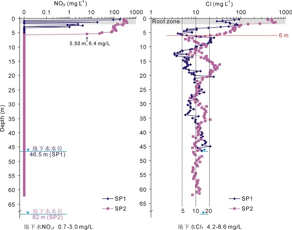在该背景下,黄天明副研究员和庞忠和研究员等利用在黄土高原包气带分层采样技术,首次将采样钻孔剖面由包气带贯通到地下水水位(剖面深度46.5 m和62 m,而以往深度最大一般在10m左右),利用多种环境示踪剂,包括Cl、NO3、Br、2H、18O、13C、3H和14C,研究了典型黄土塬区地下水补给特征(图1)。结果显示,作为区域主要的土地利用类型,在农田区确定的补给量为55–71 mm/yr,年降水入渗到地下水水位的时间在160年到400年。地下水不含氚,属于次现代水或古水,其14C校正年龄为大多在几千到几万年。地下水主要受7到9月份雨季降水补给。包气带浅部Cl和NO3含量显著高于包气带深部和潜水中的含量,主要受到了近期人类活动的影响(图2),说明浅层地下水尚未与目前近地表过程达到水力平衡。