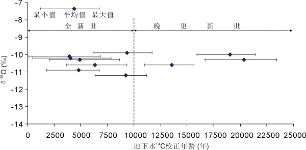 图3 地下水氧-18与14C年龄的关系