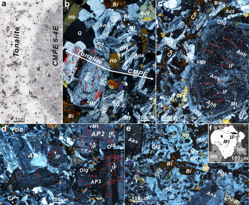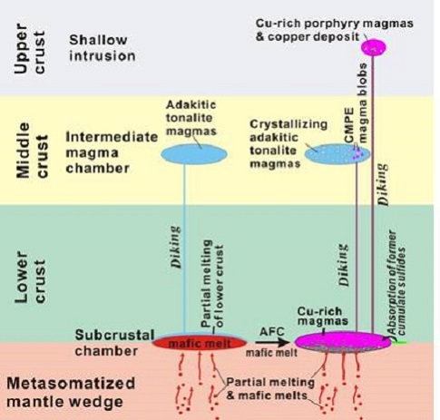 近期他们在中亚斑岩铜矿带新疆东准噶尔琼河坝斑岩铜矿区桑南英云闪长岩中发现富铜斑状基性包体,并开展了包体与围岩详细的岩石学、地球化学、年代学、矿石学与成矿作用的研究,结果显示:1.基性包体含有斑状结构、浸染状硫化物和碎裂的堆积斑晶,含有快速结晶形成的细长板状斜长石和针状锆石基质,钾长石、黄铜矿和绿帘石呈交生结构(图1),与主岩有着不同的地球化学成分,但与主岩具相似的形成深度和锆石年龄,为富Cu的镁铁质岩浆滴;2.岩石学与岩石化学特征显示基性包体属于高钾钙碱性闪长质岩浆、形成于正常岛弧背景,而主岩英云闪长岩具埃达克质的特征、可能形成于基性下地壳的部分熔融;3.基性包体多由含磁铁矿的壳和Cu-Fe硫化物核组成,大多数Cu-Fe硫化物呈填隙状分布于基质硅酸盐矿物更长石、钾长石和石英之间、并表现出交生结构(图2a,2b),少量Cu-Fe硫化物分布晶洞中(图2c)、并发育黄铜矿-绿帘石的嵌晶结构(图2d),包体记录了斑岩铜矿系统岩浆结晶与流体析出和沉淀的完整过程。研究指出富铜斑状基性包体岩浆形成于地壳底部岩浆房中的氧化的玄武质岩浆的结晶分异作用(图3)。