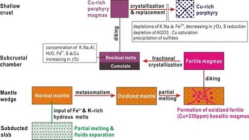 基于基性包体研究,他们提出与建立了富铜斑岩岩浆形成机制模型(图4):活动大陆边缘俯冲板片的俯冲过程可造成洋壳的部分熔融和流体的析出;一些富K+和Fe3+的水-熔体运移进入俯冲板片上覆的岩石圈地幔、并交代岩石圈地幔,岩石圈地幔被氧化并在流体的诱发下发生部分熔融、形成高铜富绕的、氧化的玄武质岩浆;这些玄武质岩浆上侵于壳幔边界并发生结晶分异作用,残余岩浆中富集K、Na、Al、Fe3+、H2O、S与Cu,氧逸度(¦O2)升高;这些富铜的、包含斑晶的岩浆被岩墙输送到地壳浅部形成富铜斑岩岩浆;斑岩岩浆通过矿物的结晶作用及K、Na和Fe3+的耗竭而导致岩浆-流体系统氧逸度(¦O2)降低和硫的还原,岩浆-流体中Al2O3的耗竭可导致铜的过饱和,Fe-Cu硫化物在晚期岩浆-热液阶段的沉淀形成斑岩铜矿。即斑岩铜矿岩浆起源于被俯冲流体交代的、氧化的地幔楔的部分熔融,成因于氧化的、富饶的玄武岩浆的结晶分异。此外,他们还提出了斑岩成矿系统中硫还原的一个新机制,即岩浆-流体中一价铜氧化为二价铜过程伴生硫的还原:Cu+ + SO2 + H+ ® Cu2+ + S2- + H2O