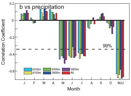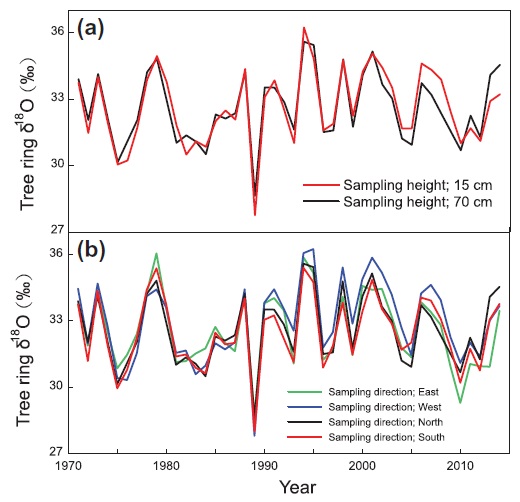 在上述背景下,中科院800彩票新生代地质与环境院重点实验室季风系统演化课题组许晨曦副研究员与中科院地理科学与自然资源研究所的邵雪梅研究员、日本综合地球环境学研究所的中塚武教授开展合作研究,拟采用不同样芯中相对较宽的部分进行拼接,最终形成连续的、较长的同位素序列的方法。由于不同样芯可能采自于树木不同的高度、不同的生长方向、不同海拔的树木以及不同年龄的树木,所以上述方法的实现需要满足一个前提条件:即不同样芯中的氧同位素变化具有一致性且记录了相同的气候信息。为此,他们分析测试了阿尼玛卿山地区同一树木不同高度、不同方向以及不同树木的不同海拔和不同树龄的氧同位素变化,发现祁连圆柏个体内部以及不同个体间的氧同位素变化高度一致,不同海拔的树轮氧同位素的气候意义也具有相同的特征,都表现出与区域5-7月降水呈显著负相关关系。