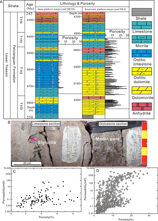 中科院800彩票油气资源研究院重点实验室姜磊副研究员等人以经典的四川盆地下三叠统飞仙关组碳酸盐岩为研究对象,以沉积岩石学为基础,通过详细的矿物学观察与成分统计,结合碳、氧、锶同位素及流体包裹体等地化分析手段,并运用成岩作用模拟、储层压力及孔隙度渗透率模拟等方法,系统研究并对比了飞仙关组鲕立滩相白云岩与灰岩成岩作用与储层发育模式。明确提出了白云岩储层优于灰岩的两个重要原因:(1)白云岩抗压实能力较灰岩强,具体表现为灰岩中的孔隙被压实作用产生的方解石胶结,其孔隙度降低至~1.8%,而白云岩由于缺失该类方解石胶结,其储层现今孔隙度为~10%;(2)白云岩储层广泛发育的热化学硫酸盐还原反应(TSR)显著改善了储层质量。成岩作用模拟结果显示储层中至少有1.6%的孔隙度源自TSR;渗透率模拟结果表明TSR过程中储层渗透率由110 mD増高至264 mD。他们认为TSR与模拟所得的储层超压亦存在成因联系,并提出超压可能是深埋碳酸盐岩储层孔隙度得以保存及储层非均质性强的重要原因;同时TSR产生的单质硫在深埋条件下可能具有抑制矿物胶结的作用。最后,他们总结了TSR对深埋碳酸盐岩的溶蚀机制:(1)矿物溶解与沉淀的体积差;(2)反应生成淡水的稀释作用;(3)反应生成的H2S及其与Fe离子结合产生的酸性流体的溶蚀作用。