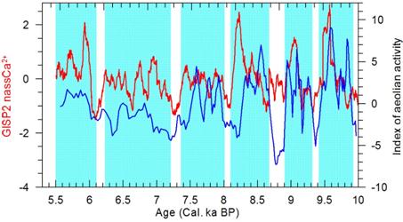 图2.西伯利亚高原控制下粉尘源区风沙活动强度与格陵兰冰心风尘沉积对比