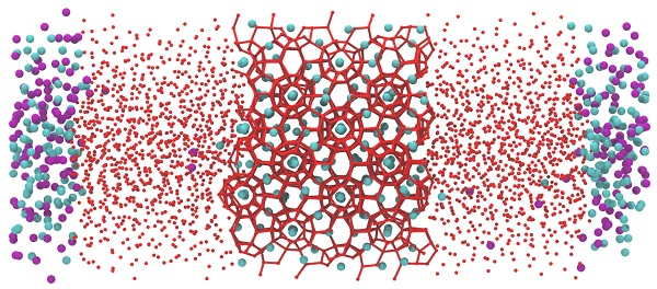 图1:模拟体系的初始结构。红色小球为水分子;青色小球为甲烷;紫色小球为氢气。水合物结构用球棍来表示