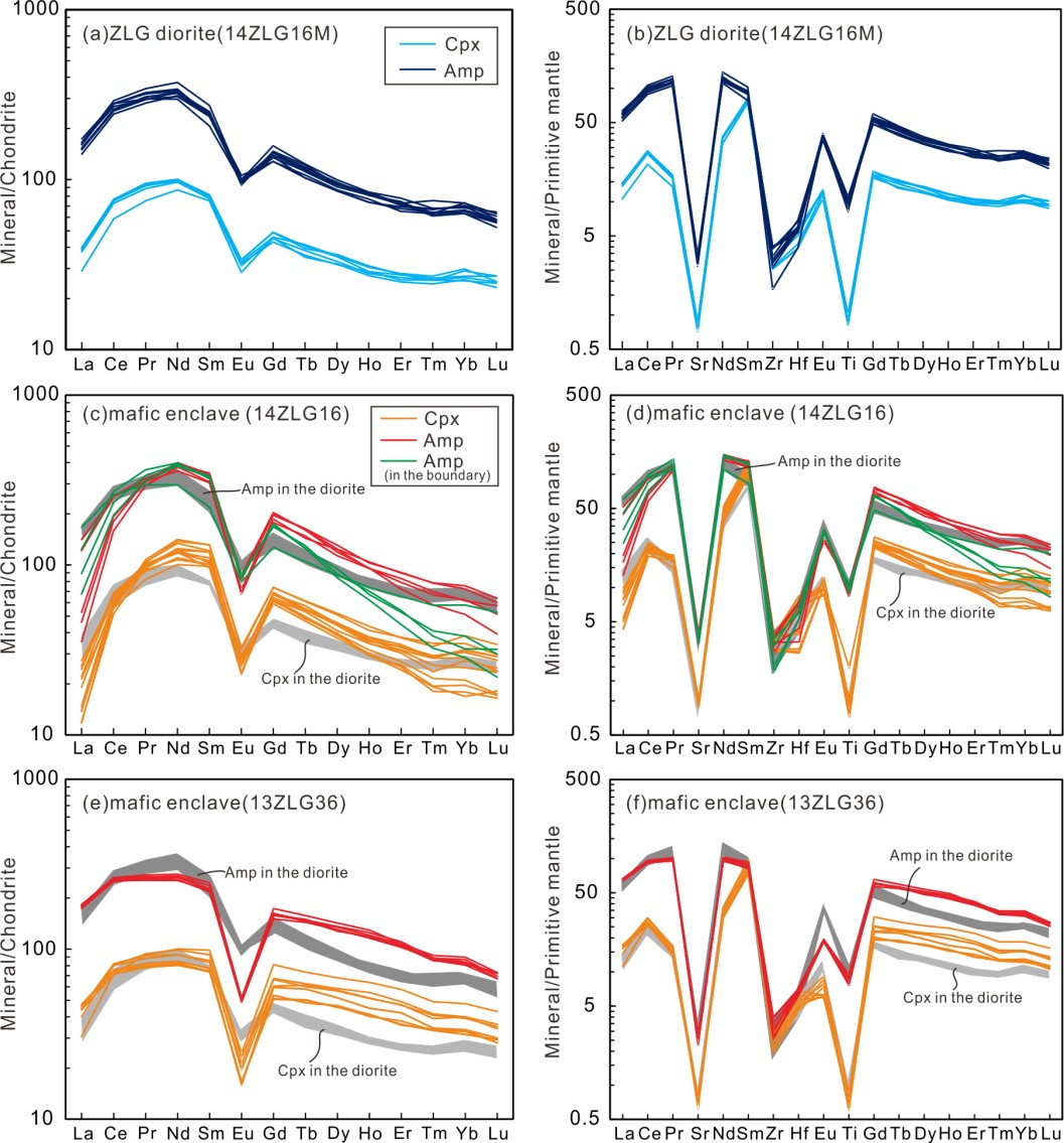 图1 朱拉沟岩体及包体的角闪石和单斜辉石的稀土元素配分及微量元素配分图