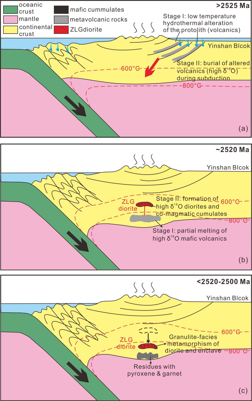 研究结果显示:朱拉沟岩体中的单斜辉石和角闪石与包体的单斜辉石和角闪石具有相似的主微量元素特征(图1),暗示镁铁质包体是闪长岩体的暗色矿物堆晶体,因此,闪长岩体的富集镁铁质成分取决于暗色矿物(角闪石和单斜辉石)的比例不同。此外,闪长岩体具有高的锆石δ18O值(~9.0‰,图2),是目前发现的太古宙岩体中最高的δ18O值。朱拉沟岩体所记录的高δ18O值特征,并不是由围岩混染或变质作用导致的,而是代表了源区的性质。源区玄武质岩石经历了低温热液蚀变,使得氧同位素值升高,而后玄武岩被埋藏至下地壳,并发生了部分熔融,形成了高δ18O闪长岩体(图3)。矿物化学、地球化学及Sm-Nd和锆石Lu-Hf同位素结果支持闪长岩体是来自下地壳含水玄武质岩石的部分熔融,该过程可能发生在大陆边缘弧的环境(图3)。