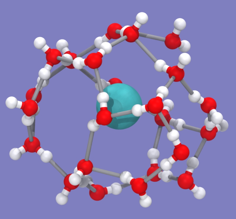 图1 甲烷水合壳的结构。红色为氧原子,白色为氢原子,灰色棍为氢键