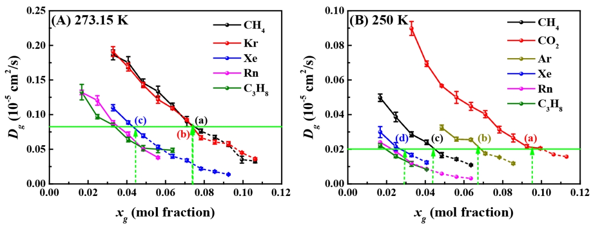 图3 溶液中气体分子的扩散系数随溶液中气体分子浓度变化而变化。绿色虚线箭头是不同气体分子形成水合物的临界浓度,绿色实线是临界扩散系数
