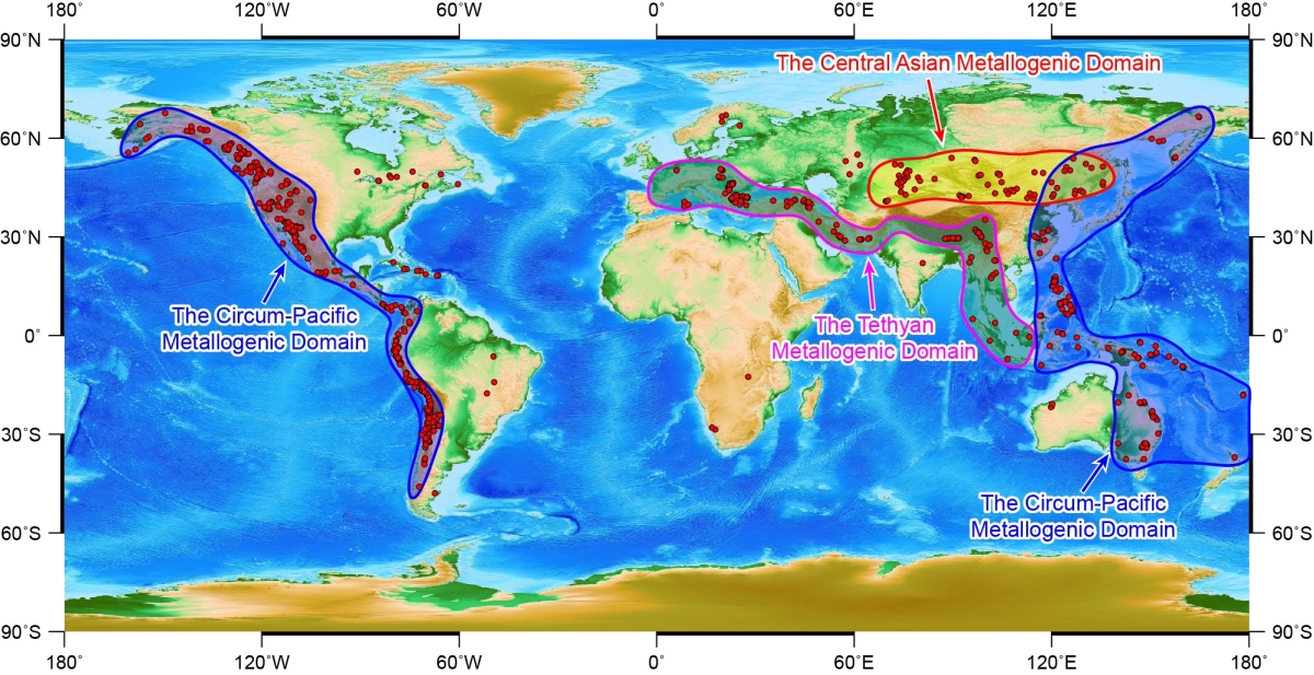图1 全球斑岩型矿床分布及环太平洋、特提斯和中亚成矿成矿域示意图