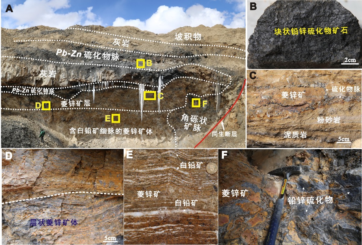 图1 A.火烧云铅锌矿区露采坑的矿石结构与构造特征;B. 块状硫化物矿石;C.菱锌矿层与砂泥岩层共生;D. 具有沉积间隔的菱锌矿石;E. 块状棕色菱锌矿中发育有充填交代的白铅矿脉;F. 铅锌硫化物胶结菱锌矿角砾