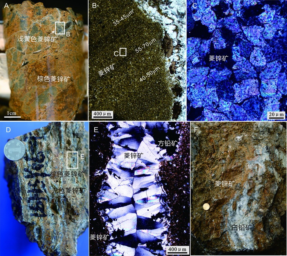 图2 火烧云铅锌矿主要矿石结构与构造特征。A. 原生沉积菱锌矿(浅黄色)与热液交代成因菱锌矿(棕色);B. 原生菱锌矿具有粒序结构的特征;C. 菱锌矿晶体之间发育压溶结构(正交偏光);D. 块状棕色菱锌矿中发育有无色菱锌矿脉;E. 无色菱锌矿脉穿过块状菱锌矿;F. 白铅矿充填交代于块状菱锌矿裂隙中