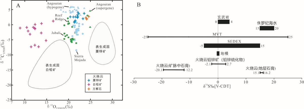 图4 火烧云铅锌矿地球化学特征。A. 火烧云菱锌矿与白铅矿C-O同位素特征,并与常见的表生成因菱锌矿与白铅矿的C-O同位素组成、一些铅锌矿中表生菱锌矿组成,如 Sierra Mojada 矿、Reef Ridge 矿、Jabali 矿及Angouran 矿中的表生与深成的菱锌矿组成进行对比;B. 火烧云铅锌硫化物(主要是方铅矿)及伴生石膏,矿区地层石膏S同位素组成,并与玄武岩、地幔、侏罗纪海水、SEDEX型铅锌矿及MVT型铅锌矿的S同位素进行对比