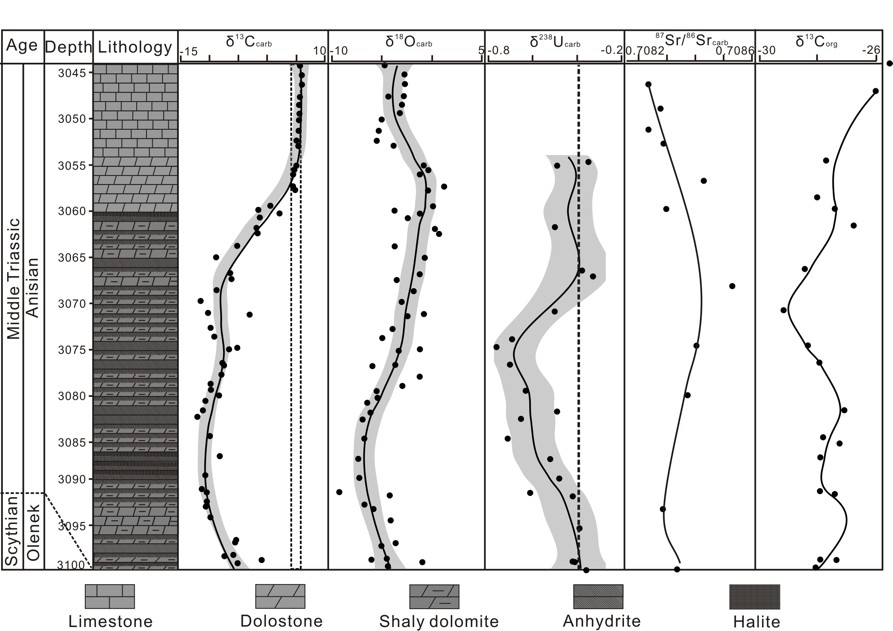 中国科学院800彩票油气资源院重点实验室姜磊副研究员,与耶鲁大学Noah Planavsky等合作,通过对四川盆地中三叠统雷口坡组泻湖相碳酸盐岩与蒸发岩的钻井样品的高精度C/O/U同位素分析,发现了全球首例类似Shuram事件在显生宙的地质实例,并证实早成岩阶段细菌硫酸盐还原反应促使的碳酸岩自生过程,导致了碳酸盐岩的大幅度δ13C和δ238U负漂。