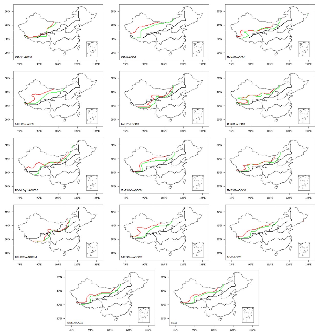 PlioMIP)中共16个气候模式的数值模拟结果,重建了中上新世和工业革命前东亚夏季风北边缘(图1),并与地质记录重建结果(图2)进行了对比,探讨了东亚夏季风北边缘位置变化机制(图3)。主要结论如下: