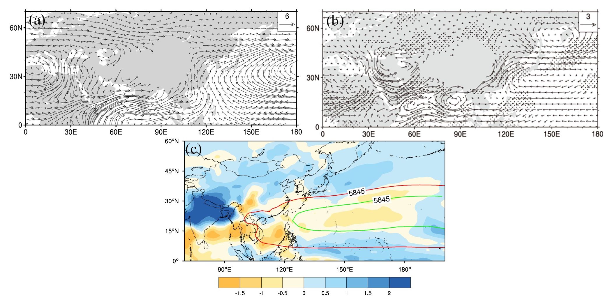 多模式集合平均夏季850hPa风场(单位:m s–1)分布图;(b)中上新世与工业革命前多模式集合平均夏季850hPa风场(单位:m s–1)差异场;(c)500hPa位势高度场5845线,红色为上新世,绿色为工业革命前
