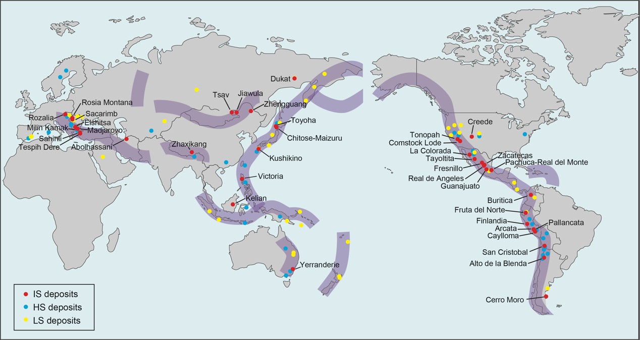 图1 全球IS矿床的分布(主要的高硫型和低硫型矿床的分布也标于图中进行对比;紫色区域代表与板块俯冲有关的成矿带)