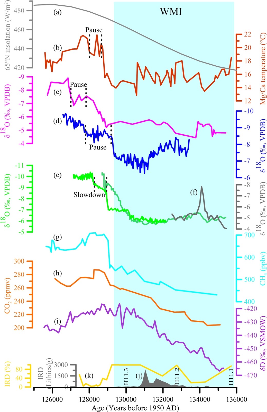 倒二冰消期时全球古气候记录对比。(a)北纬65度夏季太阳辐射。(b)北大西洋深海钻孔ODP976浮游有孔虫壳体Mg/Ca重建的海表温度记录。(c)以色列洞穴石笋记录。(d)河北兴隆洞石笋记录(本研究)。(e)湖北三宝洞(浅绿,深绿)和南京葫芦洞(黑色)记录。(g)(h)(i)分别为南极冰芯Vostok(年代标尺为AICC2012)甲烷浓度,二氧化碳浓度和氘同位素记录。(j)北大西洋深海钻孔980冰筏记录,调谐于三宝洞石笋年代。(k)北大西洋埃里克钻孔MD03-2664冰筏记录,调谐于意大利Corchia洞穴石笋年代。箐色柱(WMI):倒二冰消期内的弱东亚夏季风时段。黑色虚线:末次间冰期开始后的增温暂停“Pause”和气候改善速度减缓“Slowdown”事件