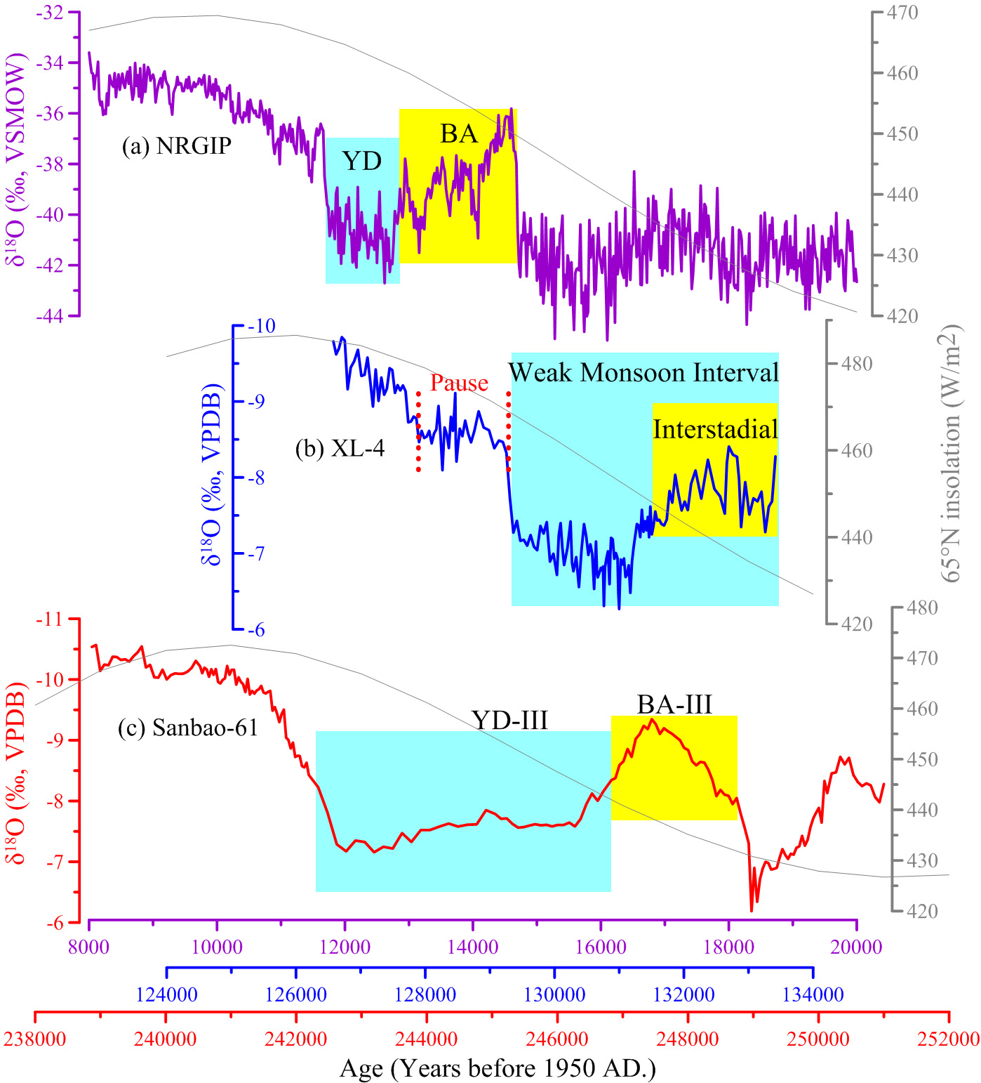 最近三个冰消期气候记录对比。(a)末次冰消期格陵兰冰芯δ18O记录。YD:新仙女木事件,BABolling/Allerod暖事件。(b)倒二冰消期河北兴隆洞石笋XL-4δ18O记录(本研究)。Weak Monson Interval:弱季风时段,Interstadial:间冰段事件。“Pause”:增温暂停事件。(c)倒三冰消期湖北三宝洞石笋δ18O记录。YD-III:类新仙女木事件,BA-III:类Bolling/Allerod暖事件