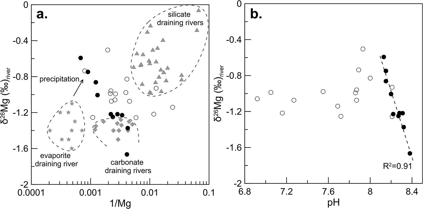 图1 (a)河水1/Mg-δ26Mg关系图;(b)河水pH-δ26Mg关系图(实心圆点为相对碳酸盐饱和的河水样品,空心圆点为相对碳酸盐不饱和河水样品)
