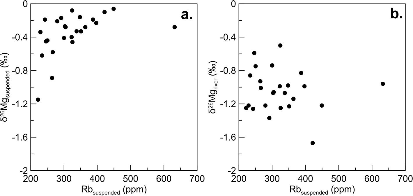 图2 (a)悬浮物Rb-悬浮物δ26Mg关系图;(b)悬浮物Rb-河水δ26Mg关系图