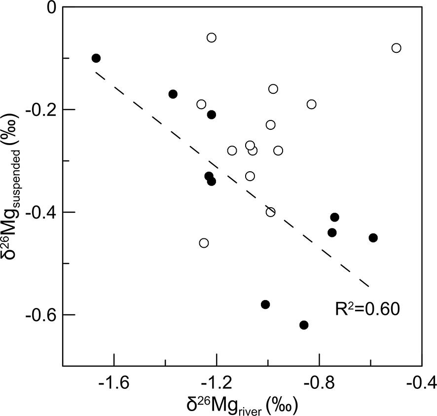 图3 河水δ26Mg与河流悬浮物δ26Mg关系图(实心圆点为相对碳酸盐饱和的河水样品,空心圆点为相对碳酸盐不饱和河水样品)
