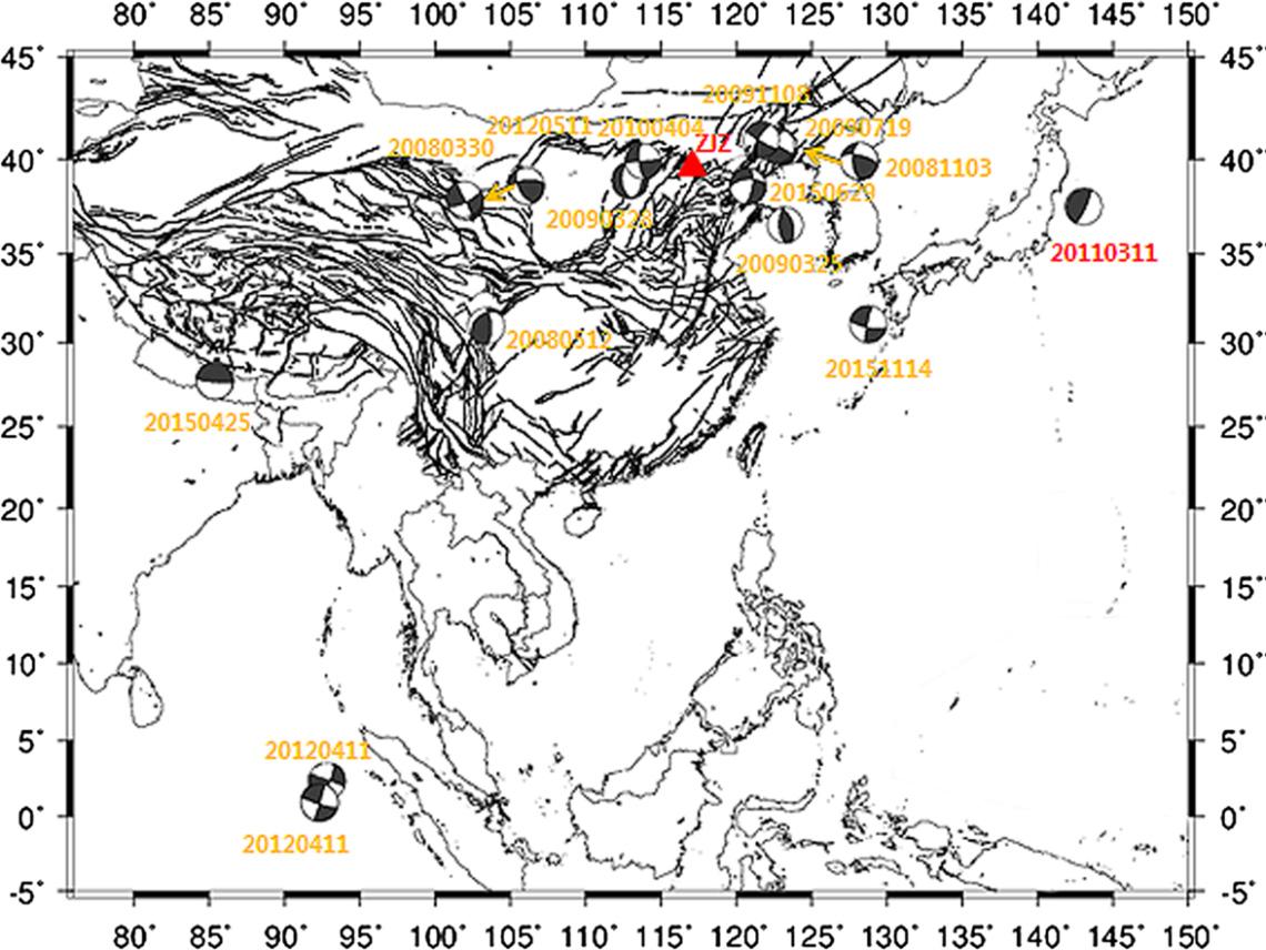 图1 左家庄井的地理位置(红色三角形)和引起左家庄井同震水位变化的地震的震中位置(沙滩球)