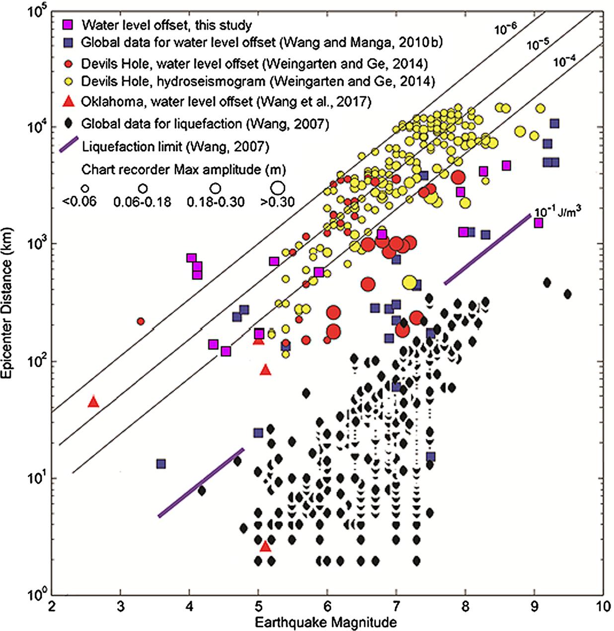 图3 地震引起的作为地震震级和震中距函数的水力变化分布图
