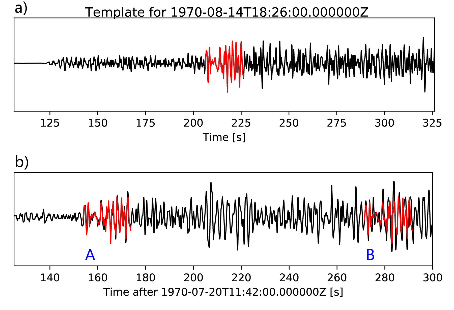 图2 a.已知月震事件,红色的波形为选定的模板波形;b. A和B分别为已知的月震事件和检测到的隐藏月震事件