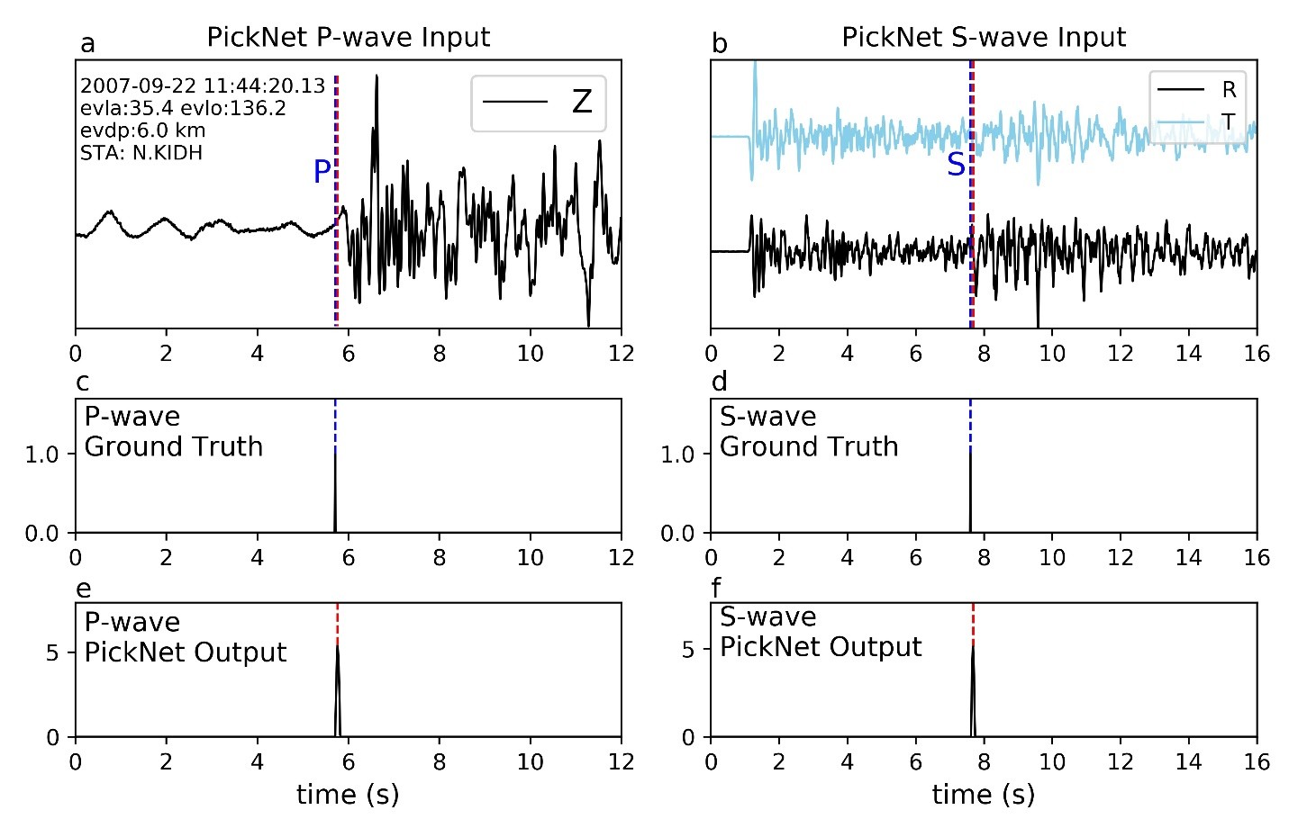 图2 PickNet输入输出示意图。(a和b), P波、S波对应台站记录(输入);(c和d), 震相到时脉冲序列(理想输出); (e和f), PickNet输出(实际输出)