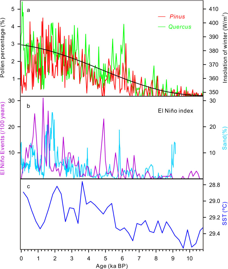 图1 月亮湖花粉记录与45°N冬季太阳辐射、2个El Nino记录以及西太平洋热带海表温度的比较。(a)月亮湖的Pinus(红)和Quercus(绿)的花粉百分比含量(指示冬季风强度)和来自45°N冬季太阳辐射(黑);(b)Laguna Pallcacocha湖泊沉积物和Northern Line群岛珊瑚化石的El Nino记录(紫和浅蓝);(c)热带西太平洋有孔虫的海表温度记录(深蓝)