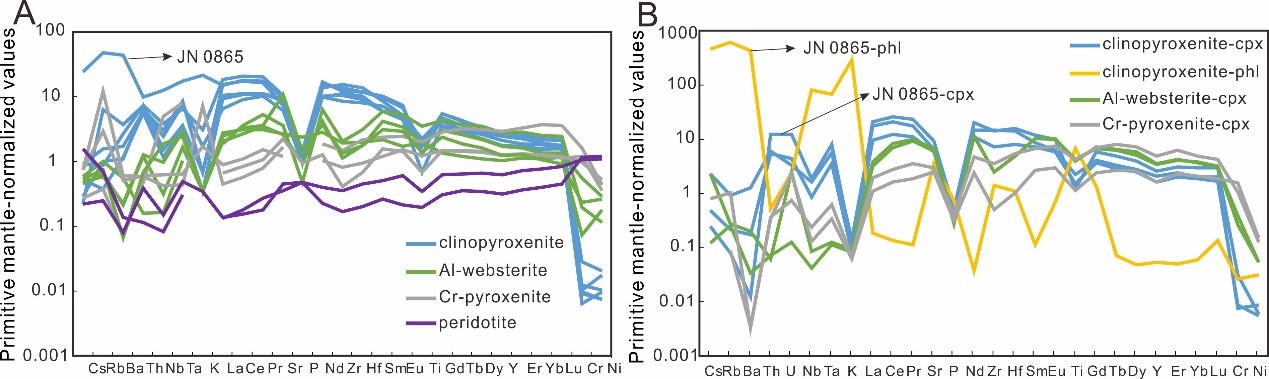 该研究综合运用了矿物学、岩石学、同位素地球化学和年代学研究等多种手段,将汉诺坝(金云母)单斜辉石岩从前人已有的辉石岩分类中剥离出来,合理解释了(金云母)单斜辉石岩的成因,限定了交代介质的类型、交代熔体的来源、交代作用的时间及原岩性质和时代等,并首次通过受俯冲作用交代的深部岩石圈的产物探讨了俯冲板片地温梯度,为未来俯冲板片地温梯度模型的研究提供了新的思路。