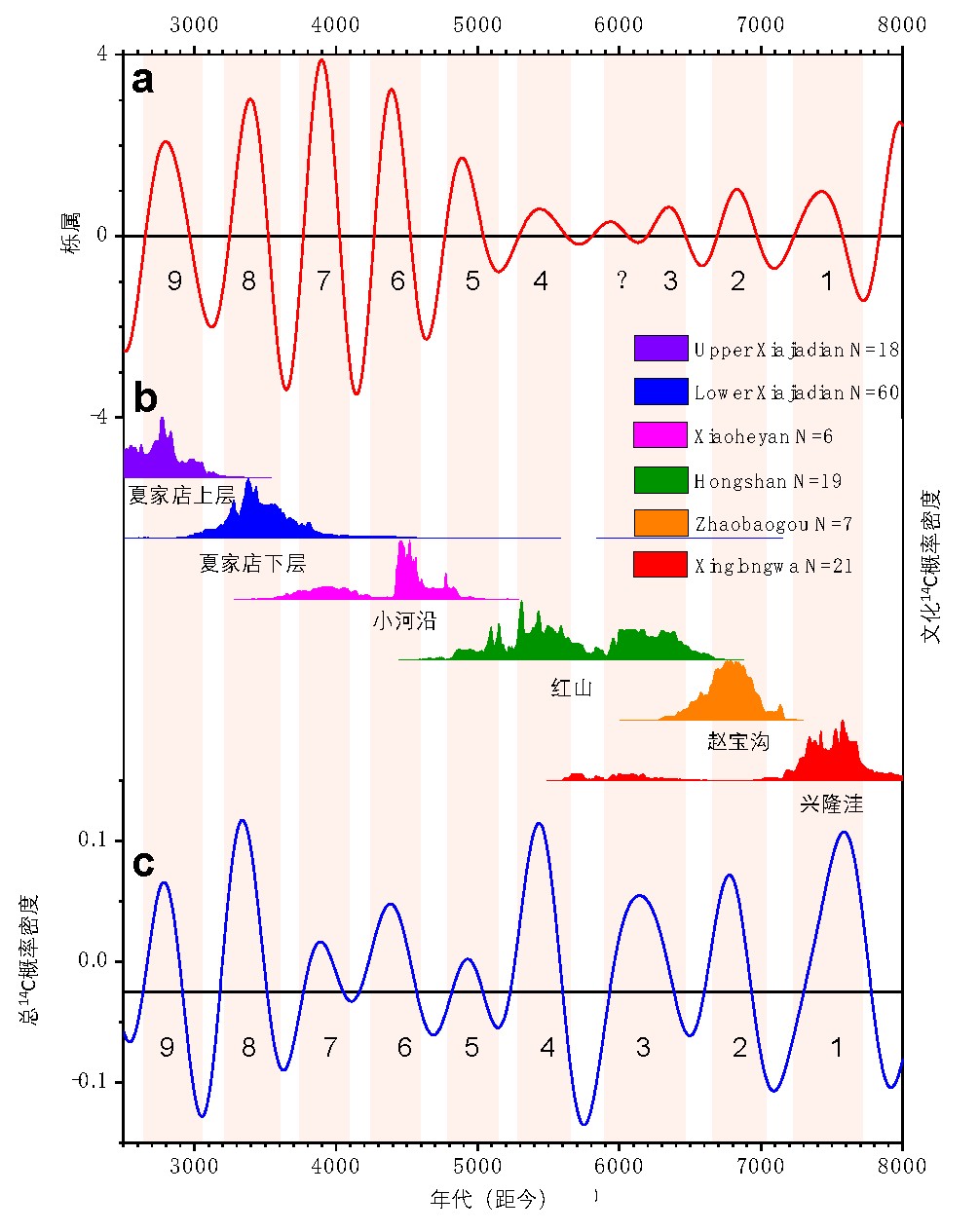 对比气候变化和人类活动的结果表明,花粉记录的季风气候变化和碳十四概率密度揭示的人类活动存在约500年周期的同步变化,部分人类活动周期相位略滞后了几十年。季风气候周期性的暖湿/冷干与人类活动的强/弱,以及与史前文化的盛/衰的过程显著相关。在东北地区史前六个文化繁盛期中(兴隆洼文化,赵宝沟文化,红山文化,小河沿文化,夏家店下层文化,夏家店上层文化),除了红山文化(~6500 - ~5000 cal yr B.P.)无法与中全新世后期3次非常弱的500年周期对应外,其它文化期都显著对应着500年周期夏季风加强的暖湿期(图4)。