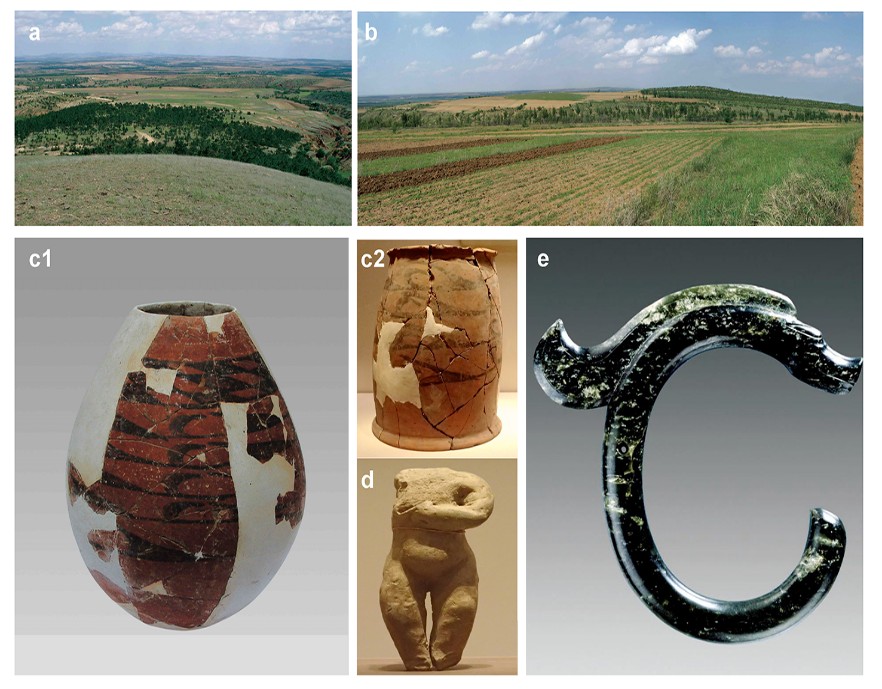 图5 红山文化的代表性遗址和出土陶、玉器 (a,b,c1,e,孙永刚提供红山文化遗址和文物照片)