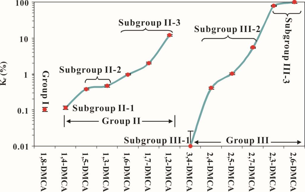 图1 各组二甲基咔唑吸附能力排序图(DMCA=二甲基咔唑; Kr = 相对吸附系数)