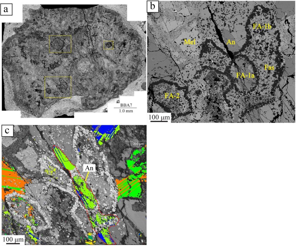 图1 Allende碳质球粒陨石中的一个火成难融包体。(a) Allende碳质球粒陨石中的火成难熔包体 (BBA-7),它富含尖晶石壳体(黄色框);(b)复合型尖晶石壳体(FA-1),其中FA-1b完全包裹着FA-1a,且两者同时被一个连续的钙长石晶体穿插;(c) 尖晶石壳体的背散射电子衍射结果。白色为尖晶石,彩色为不同取向的钙长石。矿物缩写:Mel=黄长石;An=钙长石;Fas=富铝钛透辉石