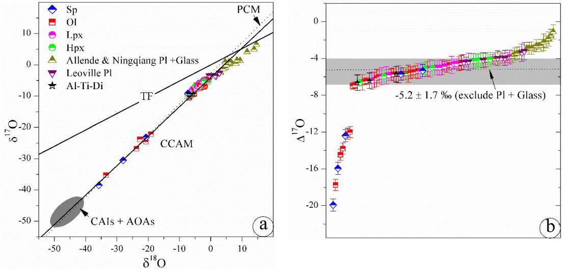 图3 富铝球粒的矿物氧同位素组成;残余的橄榄石和尖晶石显著富集16O(Δ17O低至~-20‰),类似于难熔包体矿物的氧同位素组成;原位结晶的橄榄石和辉石显著贫16O(Δ17O ~-5‰),类似于与铁镁质球粒中的结晶相;斜长石则不同程度的贫16O(Δ17O ~-5‰到-1‰),指示它们受到了母体小行星热液流体交代作用的影响。矿物缩写:Sp=尖晶石;Ol=橄榄石;Lpx=低钙辉石;Hpx=高钙辉石;Pl=斜长石;Al-Ti-Di=富铝钛透辉石。PCM=原始球粒矿物线(斜率0.987,Ushikubo, 2012); CCAM=碳质球粒陨石无水矿物线(斜率0.941;Clayton, 1993)