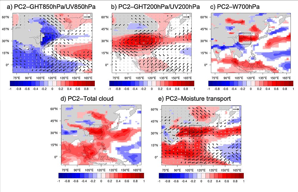 图1 暖季(五月至九月)降水一致变化模态匹配的大气环流的相关图。(a)850hPa水平风异常场(矢量)和850hPa位势高度异常场(阴影);(b)200hPa水平风异常场(矢量)和200hPa位势高度异常场(阴影),(c)700hPa垂直风异常场(-Ω,阴影);(d)总云量异常场(阴影),和(e)对流层整层积分水汽输送异常场(矢量)和可降水量异常场(阴影)。矢量图为通过90%置信检验的相关系数,黑色箭头对应于通过90%置信检验的相关系数,灰色箭头表示未通过显著性检验的相关系数;黑框表示降水一致变化模态的核心区域