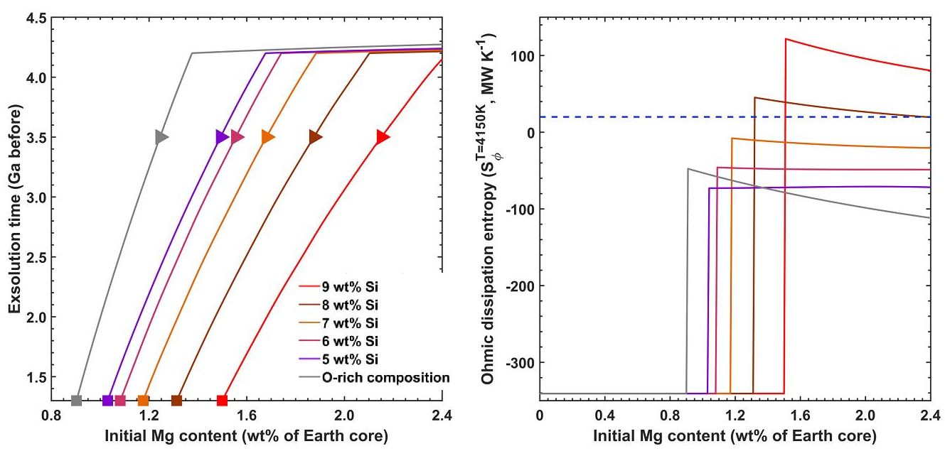 图2 (a) 地核起始镁含量与镁析出时间关系。富氧地核的起始轻元素含量为5 wt% O以及2 wt% Si,其它起始地核轻元素含量由假设氧含量与硅含量具有固定比值2.7来决定。在固定起始地核成分情况下,镁的含量越高镁析出时间越早。三角代表在35亿年前开始析出的情况。方块代表在13亿年前开始析出的情况。(b)地核起始镁含量与镁析出推动地核发电机所产生的欧姆耗散熵关系。为推动发电机,至少需要20MW/K的欧姆耗散熵,对应图中的蓝色虚线。当起始硅含量大于8 wt%且起始镁含量大于1.8 wt%时,镁可以在35亿年前开始析出,并为地磁场提供足够的能量。大于8 wt%的地核起始硅含量可以由木星土星大回转模型(Grand Tack)产生。大于1.8 wt%的地核起始镁含量可以由一个火星大小的大撞击挤入起始地核中