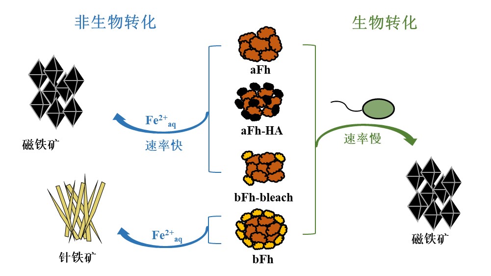 图2 非生物及微生物还原条件下四种水合氧化铁二次矿化过程示意图。其中四种水合氧化铁(Fh)包括:化学成因的水合氧化铁(aFh);与腐殖酸共沉淀的化学成因的水合氧化铁(aFh-HA);由厌氧光合铁氧化菌R. ferrooxidans SW2矿化形成的生物成因水合氧化铁(bFh),以及用漂白剂处理去除生物有机物的生物成因水合氧化铁(bFh-bleach)
