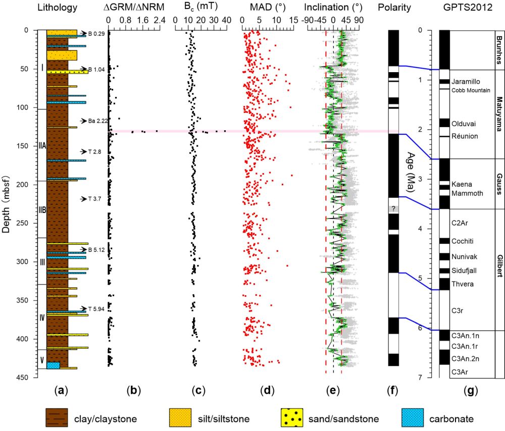图2 U1431D孔磁性年代框架。(a)沉积物岩性(修改自Li et al., 2005)及代表性钙质超微化石事件年龄。T=末现面;B=初现面;(b) △GRM/△NRM;(c)Bc; (d) MAD;(e)ChRM 倾角(绿色)和随船测量20 mT交变退磁后的倾角(灰色),红色虚线代表地心轴向磁偶极子场下钻孔所处位置的理论倾角;(f) U1431D孔的极性柱和(g)地磁极性年表(Gradstein et al. , 2012)中黑色部分指示正极性,白色部分为负极性,灰色部分指示不确定极性;粉色阴影区域指示含胶黄铁矿层