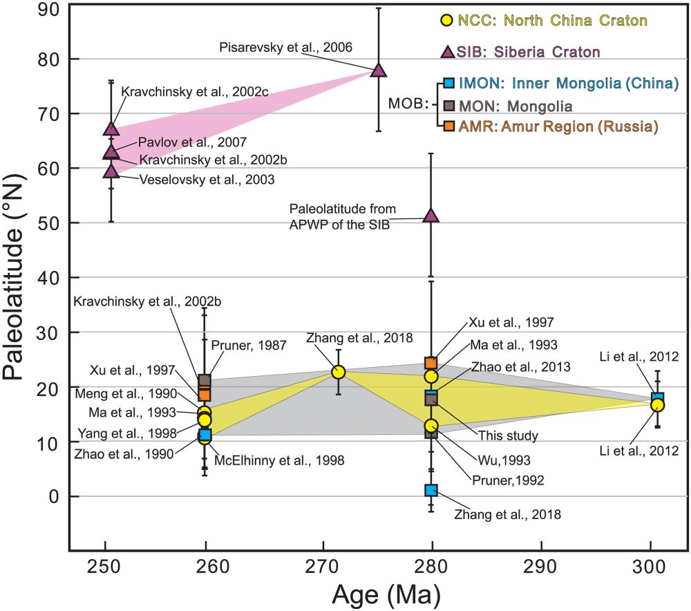晚古生代亚洲东部古地理格局以“两洋隔三陆”为特征。蒙古板块(亦称阿穆尔板块),北部由蒙古-鄂霍茨克洋与西伯利亚克拉通分隔,南部以古亚洲洋与华北克拉通相隔。蒙古板块与华北克拉通的碰撞拼合最终导致古亚洲洋的闭合。然而,目前对于古亚洲洋的闭合时间仍存在较大争议,争议的焦点在于古亚洲洋为二叠纪之前还是二叠纪末闭合。因此,准确限定蒙古板块二叠纪古纬度和古地理位置是解决该争议的有效途径。