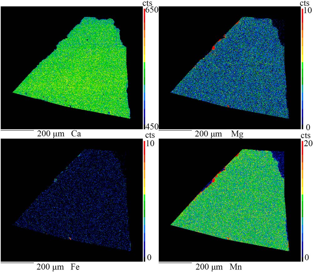 图3 Oka方解石代表性颗粒的Ca、Mg、Fe和Mn元素分布图(Tang et al., 2020)
