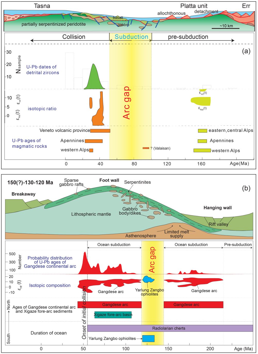 一个典型俯冲系统通常包含海沟-岛弧-盆地体系。岛弧广泛存在于大洋俯冲带,一般认为是沿着俯冲界面,由板片俯冲脱水—上覆地幔变湿后熔融诱发的岩浆喷发所形成。作为深部物质的岩石学“探针”,岛弧岩浆岩携带了俯冲界面的物质信息,是认识俯冲体系动力学特征的重要依据。然而,有一种“另类”的俯冲体系,尽管其他证据可以证明俯冲正在/曾经发生板片俯冲作用,但缺失岛弧岩浆岩喷发的证据,地球科学家称之为“无岩浆型俯冲带”(magma-poor subduction),比如阿尔卑斯和藏南地区下方的俯冲就是该类俯冲带的典型代表,岛弧岩浆空白(arc gap)时间窗分别长达40-50、10-30百万年(图1)。为何这类俯冲带未能发育岩浆作用,其动力学机制一直是学术界争论的焦点问题之一。