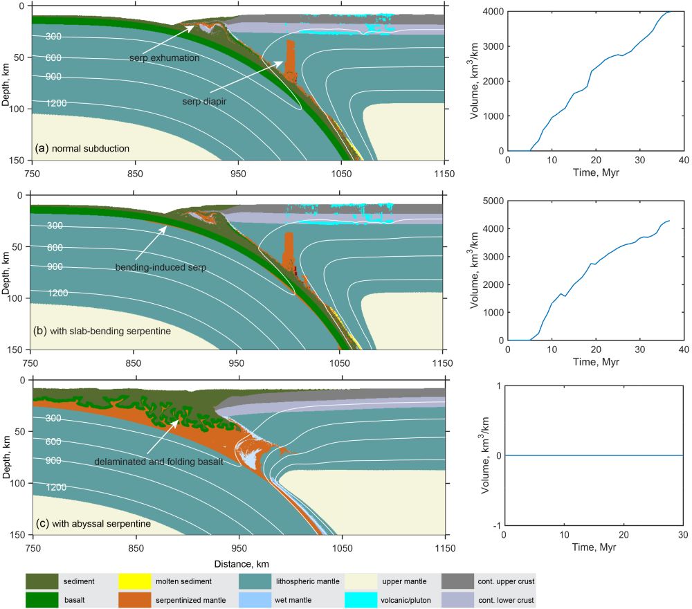 图2 左列显示数值模拟的三种俯冲板片端元模式,右列为相应俯冲体系产生岩浆量随时间的变化曲线。(a)正常厚度洋壳;(b)正常厚度洋壳+板片弯曲形成的蛇纹石化地幔;(c)薄洋壳+厚洋底蛇纹石化地幔