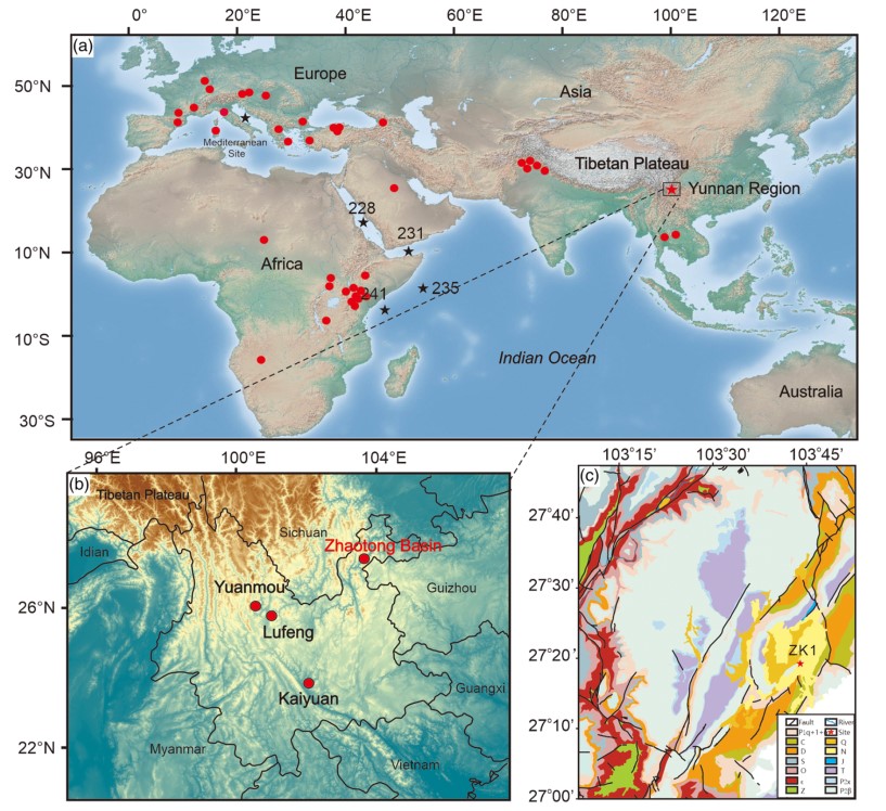 古猿在中新世曾广泛分布于非洲、欧洲和亚洲南部(图1),到了晚中新世晚期,它的数量在非洲和欧洲大幅减少,而在青藏高原东南缘的云南地区,却发现了多种禄丰古猿(约12-6 Ma)化石记录。根据地质记录,从晚中新世到上新世,全球气候和生态环境发生过重大转变,这种变化对哺乳动物的生活环境及习性产生了哪些深刻影响,为什么云南能成为晚中新世古猿“避难所”, “避难所”里的古猿最后又何以消失?在过去的30年间,不同学者对云南古猿开展了大量形态学和古环境的研究工作,但由于缺乏连续的陆相记录,一直无法完整地诠释气候变化对云南古猿的影响。